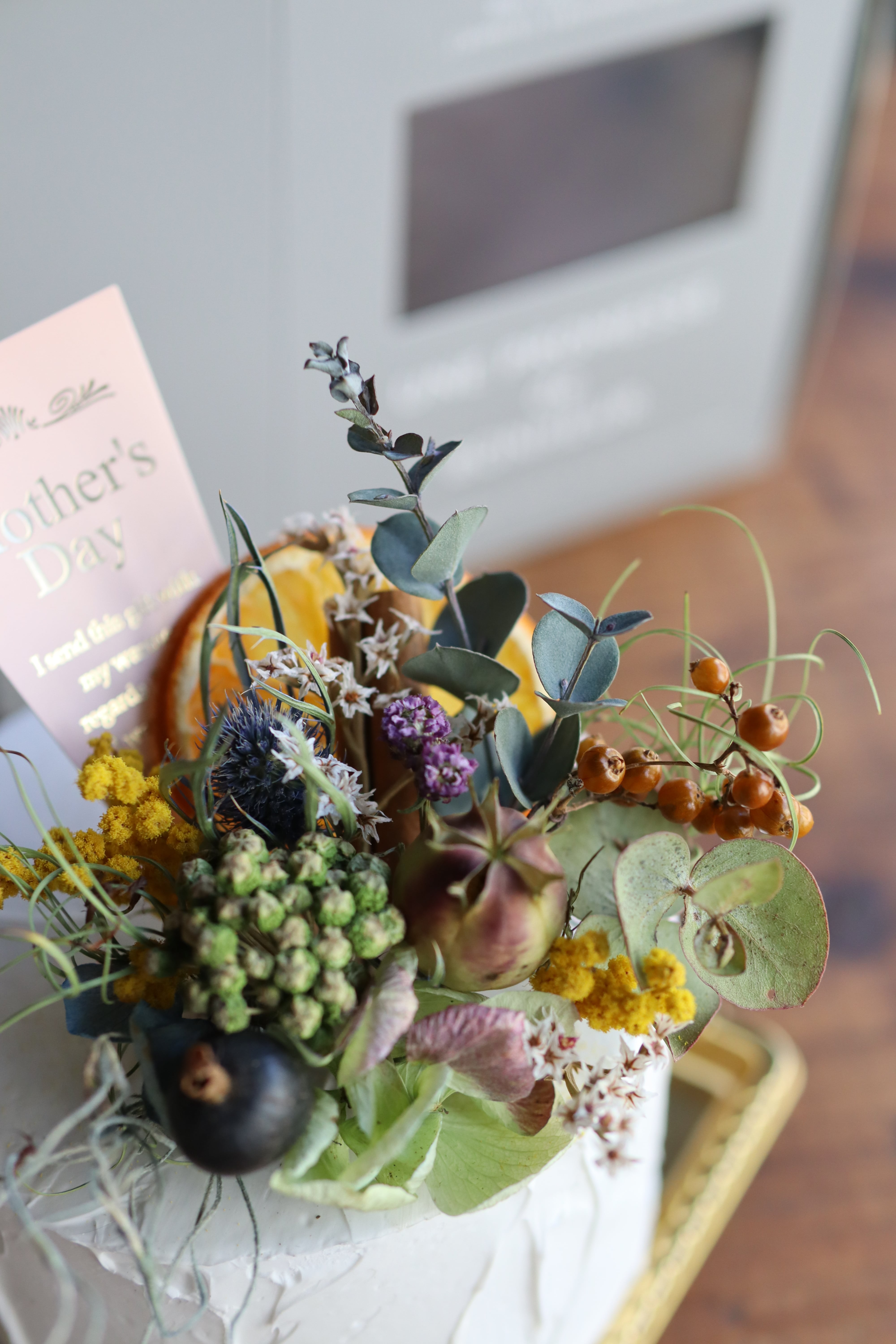 ケーキの上にドライフラワーをあしらい、特別感のある贈り物に仕上げました。