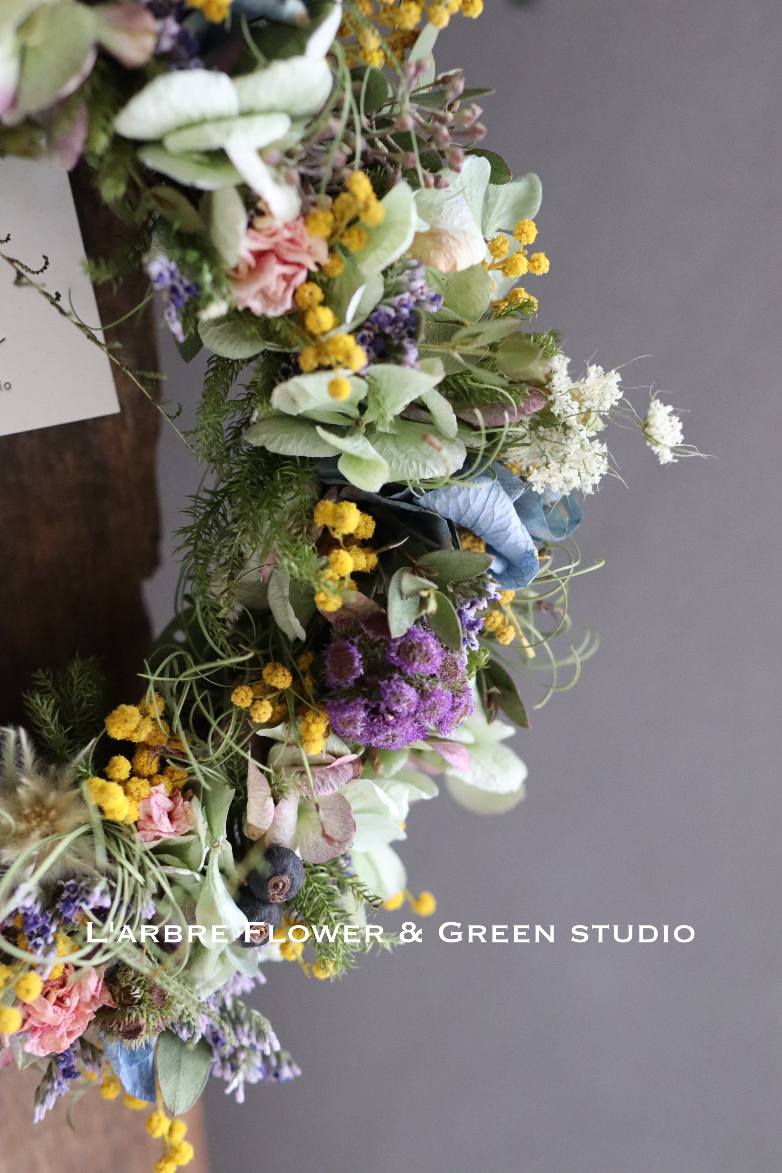 使用しているドライフラワーはすべて、L’arbre Flower & Green studio にて厳選した花材を丁寧に乾かしたものです。